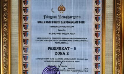 Banda Aceh – Bidang Profesi dan Pengamanan (Bidpropam) Polda Aceh menerima piagam penghargaan dari Kepala Divisi…