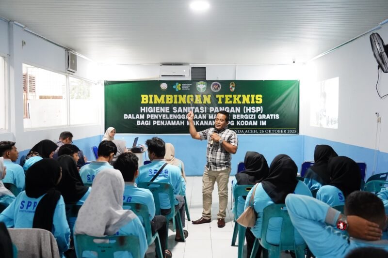 Banda Aceh — Dapur Satuan Pelayanan Pemenuhan Gizi (SPPG) Kodam Iskandar Muda (Kodam IM) menggelar Bimbingan Teknis (Bimtek) Higiene Sanitasi Pangan (HSP) dalam penyelenggaraan makanan bergizi gratis bagi para petugas SPPG Kodam IM, yang berlangsung di Dapur SPPG Kodam Iskandar Muda, Neusu Jaya, Banda Aceh. pada Minggu (26/10/2025)