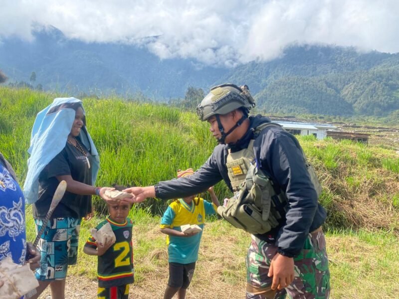 Puncak Jaya – Satgas Pamtas RI-PNG Yonif 112/DJ Pos Kota Baru terus berkomitmen dan berupaya untuk menjaga Kemanunggalan TNI dengan rakyat dengan menggelar Jum’at Berkah bagikan makanan di Kampung Pagaleme Distrik Mulia Kabupaten Puncak Jaya Provinsi Papua Tengah, Jumat (14/11/2025).