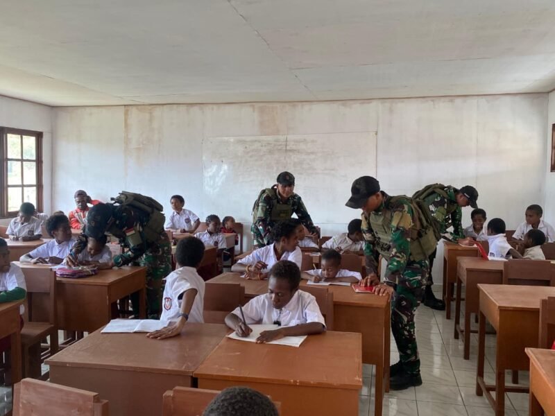 Puncak Jaya – Prajurit Pos Nume Satgas Yonif 112/DJ ajarkan wawasan kebangsaan dan cinta tanah air disekolah kepada anak-anak Papua yang merupakan sebuah proses berkelanjutan berfokus pada penguatan rasa persatuan dalam bingkai Negara Kesatuan Republik Indonesia (NKRI) di Distrik Nume Kabupaten Puncak Jaya Provinsi Papua Tengah, Kamis (30/10/2025).