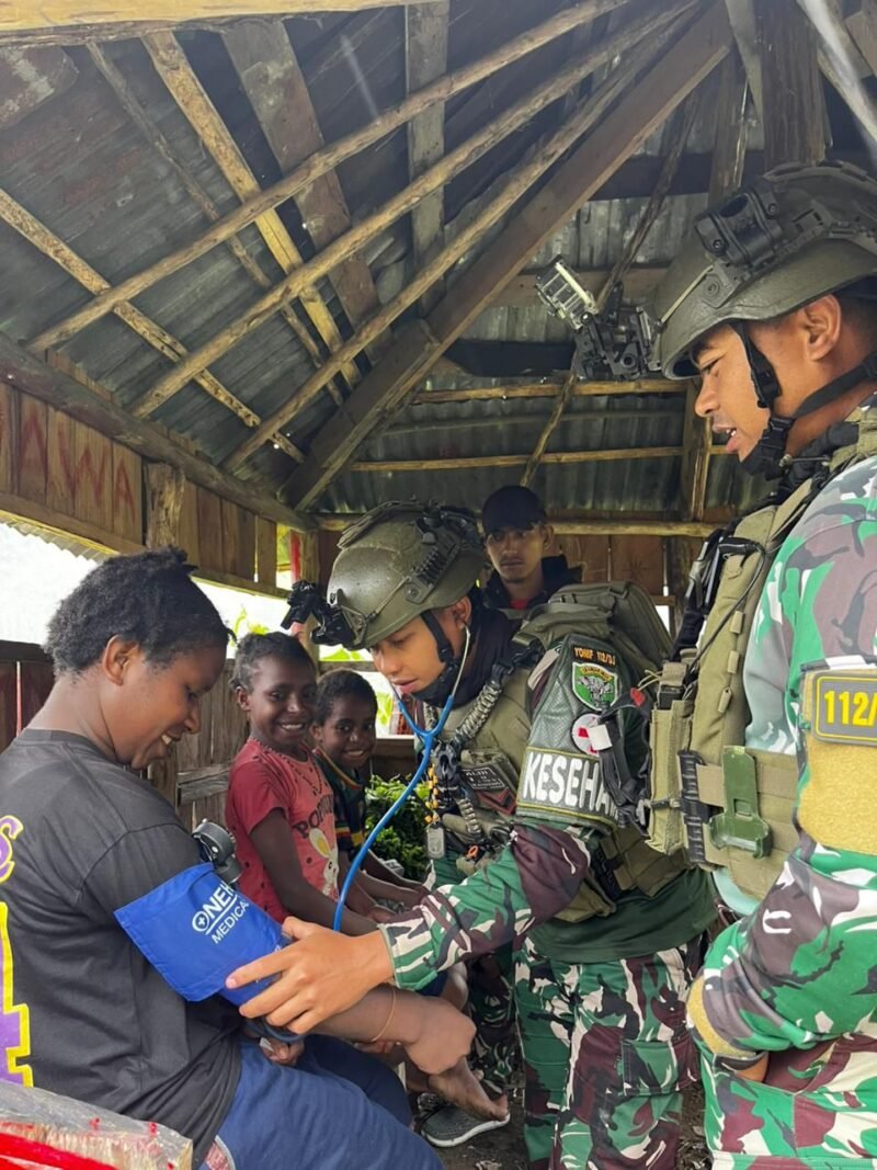Papua Tengah – Pos Kalisemen Satgas Yonif 112/Dharma Jaya kembali menunjukkan kepeduliannya terhadap kesehatan masyarakat pedalaman Papua dengan melayani pengobatan gratis dan bagikan bahan makanan di Kampung Wondengobak Distrik Mulia Kab. Puncak Jaya Prov. Papua Tengah, Minggu (23/11/2025).