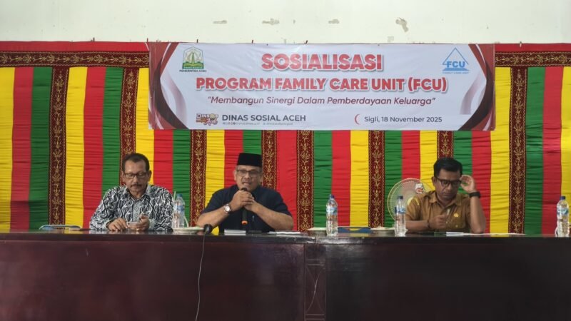 Sigli – Dinas Sosial Provinsi Aceh bekerja sama dengan Dinas Sosial Kabupaten Pidie menyelenggarakan kegiatan sosialisasi Program Family Care Unit (FCU) bagi keluarga pioner.